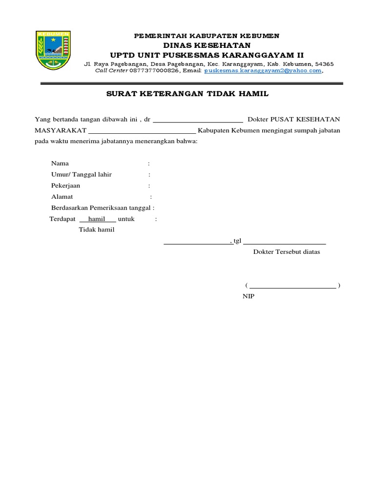 Surat pernyataan tidak hamil adalah dokumen resmi yang dikeluarkan oleh dokter yang menyatakan bahwa seseorang tidak sedang hamil. Untuk mendapatkan surat ini, seseorang harus mengunjungi dokter dan melakukan pemeriksaan urine atau darah. Surat ini sangat berguna dalam berbagai keperluan dan bisa membantu seseorang untuk mempersiapkan diri jika ingin hamil di masa depan.